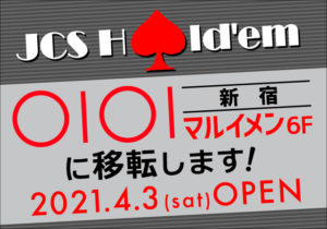 さて、この度、ポーカー教室「JCS Hold’em」は2021年4月3日(土)より下記へ移転し営業を行うことになりました。